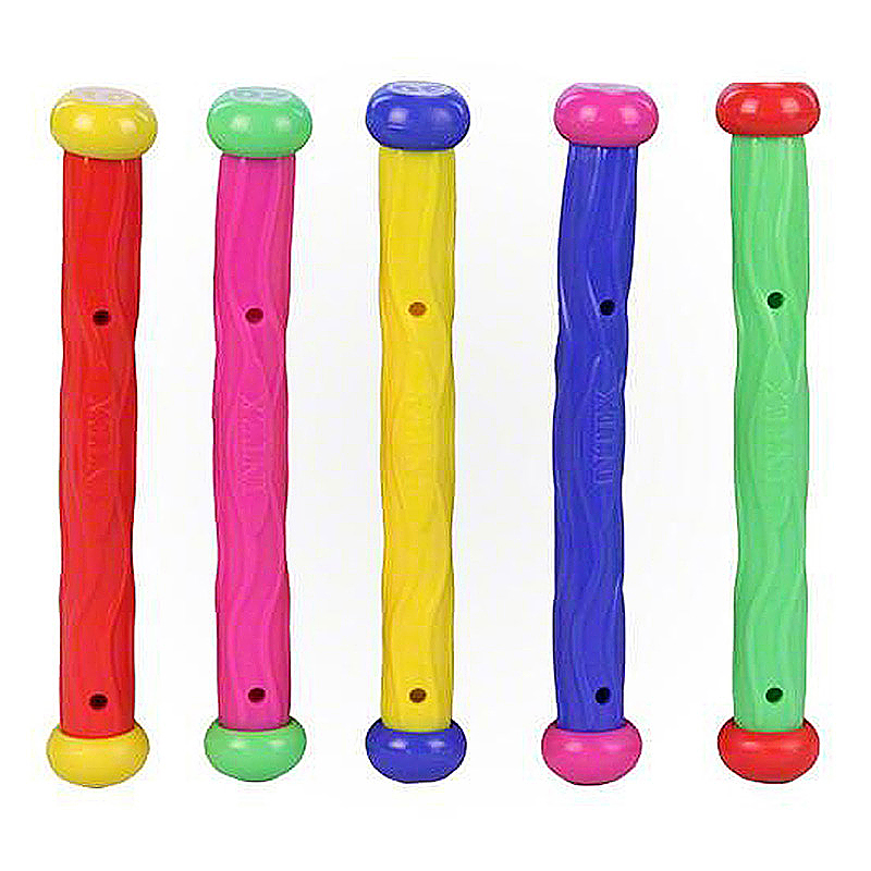 Для детей от 6 лет. В наборе пять утяжеленных цилиндров ярких цветов с навершиями, на которых цифры: 10, 20, 30, 40, 50. Комплект для использования в детских бассейнах и секциях по обучению плаванию. Флуоресцентные цвета хорошо заметны даже на дне бассейна, специальный рельеф не дает палочке выскользнуть из детской ручки.