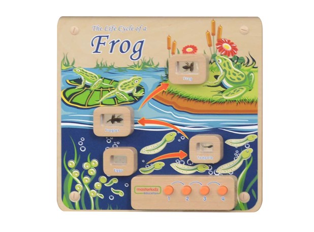 Панель для изучения жизненного цикла лягушки, с настоящими образцами, в прозрачных акриловых блоках, которые позволяют детям внимательно рассмотреть каждый из 4 этапов ( яйцо, головастика, лягушку и взрослую лягушку). Внутри каждого блока имеется подсветка, которая включается при помощи пульта.
