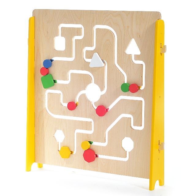 Игровая панель с желобом сложного рисунка, в который вставлены деревянные геометрические фигуры разных цветов.