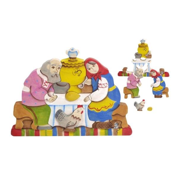 Пазл состоит из 5 частей: основания, дедушки, бабушки, курочки и, конечно же, золотого яичка.