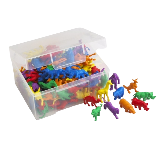 В наборе 120 фигурок диких животных в 6-ти ярких цветах 10 видов: кенгуру, медведь, носорог, верблюд, жираф, тигр, лев, слон, бегемот, орангутанг.