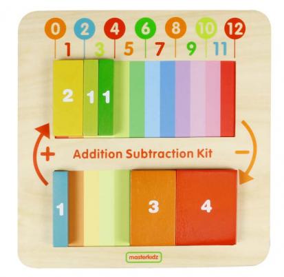 Основание панели выполнено из березовой фанеры, на лицевой части которой расположены разноцветные блоки, которые необходимо перемещать в верхнюю часть или убирать их, тем самым изучать основы сложения и вычитания. Результат отображается на верхней панели. Эта отличная обучающая игрушка для обучение детей математике.