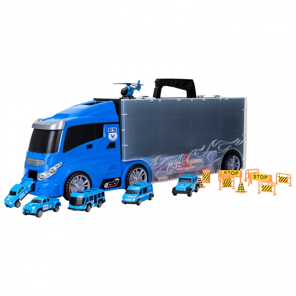 • В комплекте: автовоз-система хранения, 5 служебных автомобилей полиции, вертолет, 10 дорожных знаков.