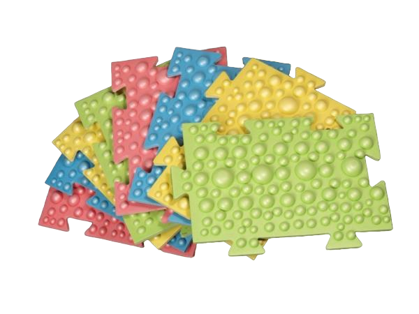 Элементы коврика покрыты выступами в форме полусфер разного диаметра. Хождение по сферам-бугоркам тренирует мышцы стоп, стимулирует рецепторы, тренирует сенсорное восприятие, помогает в профилактике плоскостопия и плоско-вальгусной деформации стопы.