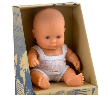 Кукла в виде девочки-карапуза с характерными чертами представителей европейской расы. Реалистичные изображения частей тела и пропорции; пальчики на руках и ногах согнуты в разной степени, обеспечивая максимальное сходство с естественным видом; подвижные руки, ноги и голова; глаза - акриловые с рисунком радужной оболочки в естественном положении, что полностью имитирует живой взгляд; рельефная имитация светлых волос. Соединения деталей надежные, кукла легко моется.