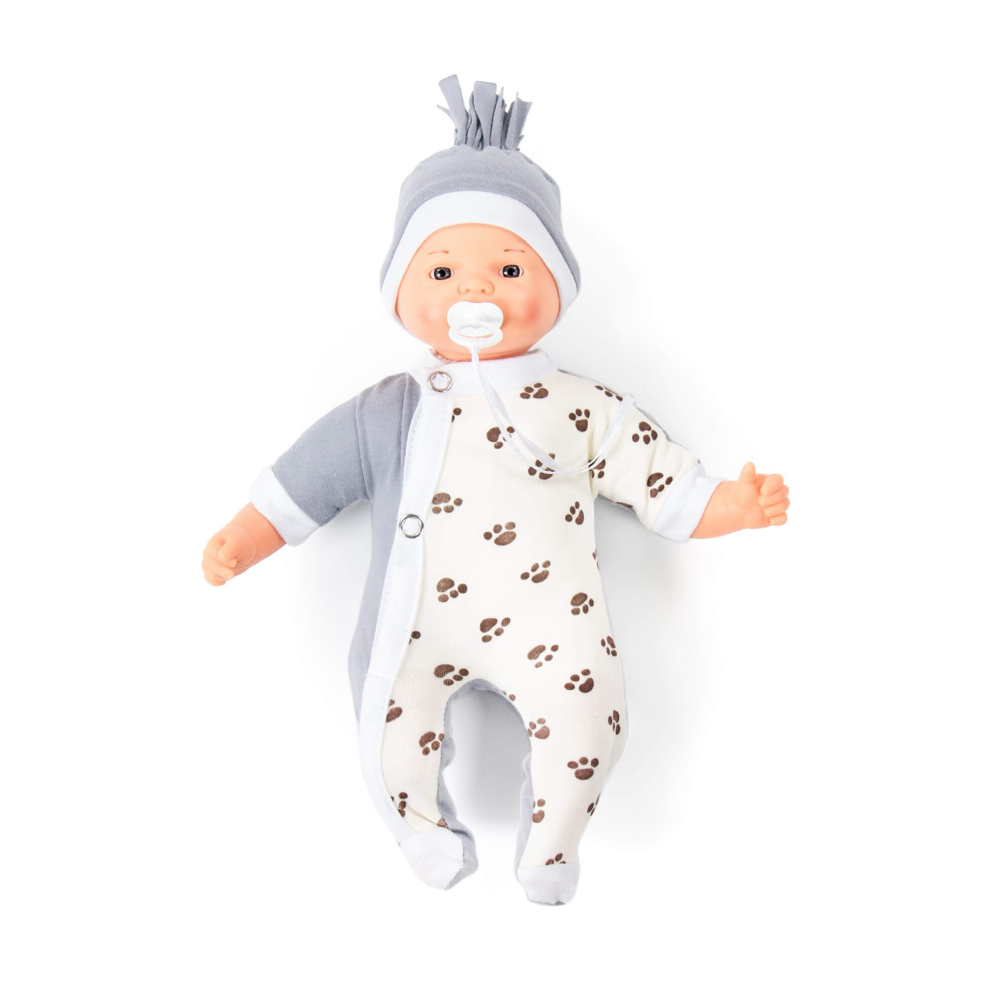 В комплекте идёт соска. Размер пупса — 28 см.