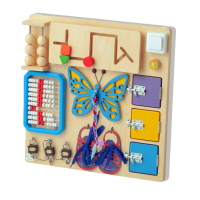 Тактильный бизиборд представляет собой легкую и прочную деревянную панель, на которой располагаются вариативные развивающие элементы: двери с замочками, счеты, шнуровка, лабиринт, выключатель и т.д.