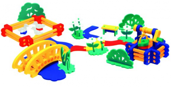 Трехмерный конструктор состоит из нескольких деталей основных цветов, которые легко выдавливаются из рамки-основы и без усилий соединяются, а также "бревен", сделанных из такого же мягкого, прочного и абсолютно безопасного материала.