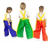 Материал - оксфорд, стропа - 100% полиэстер. У штаной спереди, сзади и по боковым швам нашита стропа с кнопками таким образом, что можно скрепить штаны дуг с другом. Это позволяет собирать несколько человек вместе для выполнения каких-то заданий или проведения эстафеты.Размер: маленький - длина 73, полуобхват 50, большой - длина 105 полуобхват 70