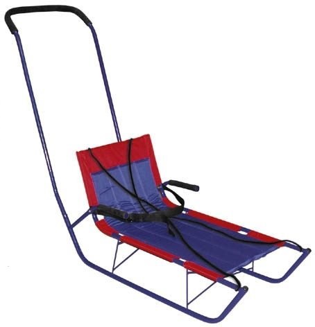 У санок удобные круглые полозья, складная база, ручка регулируется в двух положениях, имеется ремень безопасности.